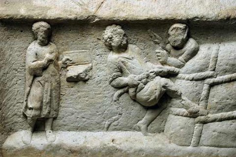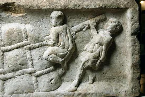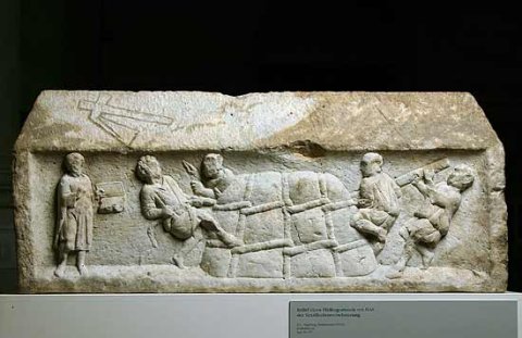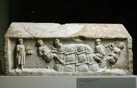 - Diener, Librarius - Scriba, Werkzeug : im Bildfeld links Mann in Ärmeltunica und Mantel, in der Linken Diptychon. In der Mitte großer Ballen, der von vier Männern mit Stricken verschnürt wird. Über dem Relief schräg zurückspringende Zone, auf der eine Haue (ascia) und ein Richtmaß eingeritzt sind.