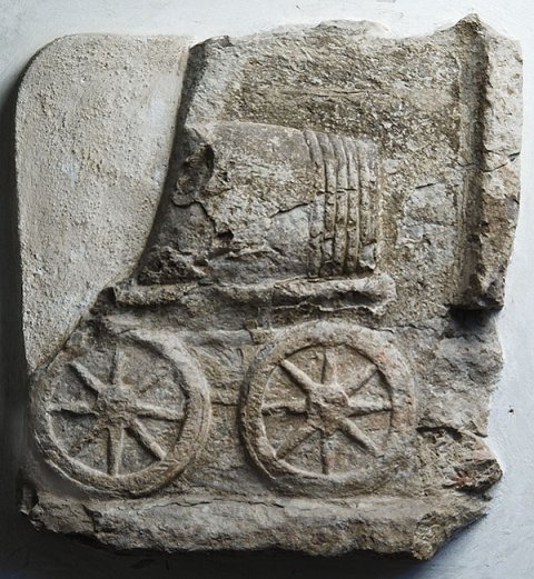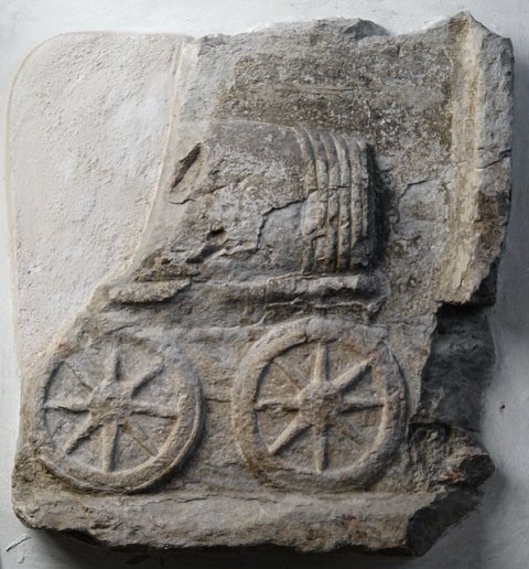 - Nach links fahrender vierrädriger Wagen, auf dem großes, mit Reifen beschlagenes Fass liegt.