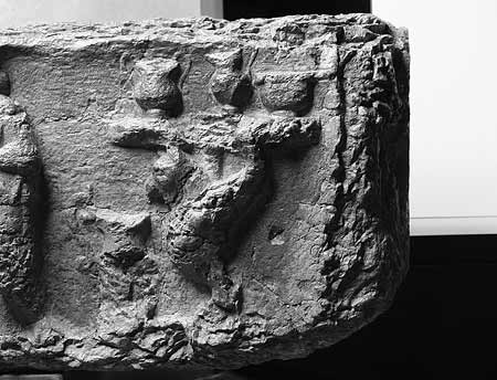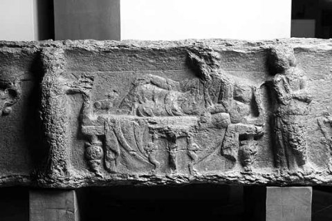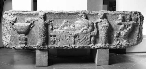 - Gelage (Totenmahl): in der Mitte Kline mit gelagertem Mann, kleiner Hund bei seinen Füßen. Vor der Kline Tischchen mit Löwenfüßen. Am Fußende der Kline stehende Frau, hinter ihr großer Kessel auf hohem Fuß, auf den Henkeln Tauben. Am Kopfende stehende Frau, hinter ihr Tisch mit massiver Stütze in Form eines Greifs, auf dem Tisch Gefäße, darunter Kanne.