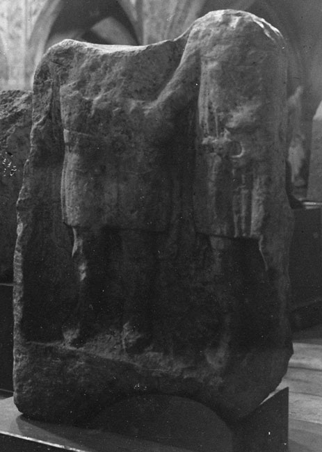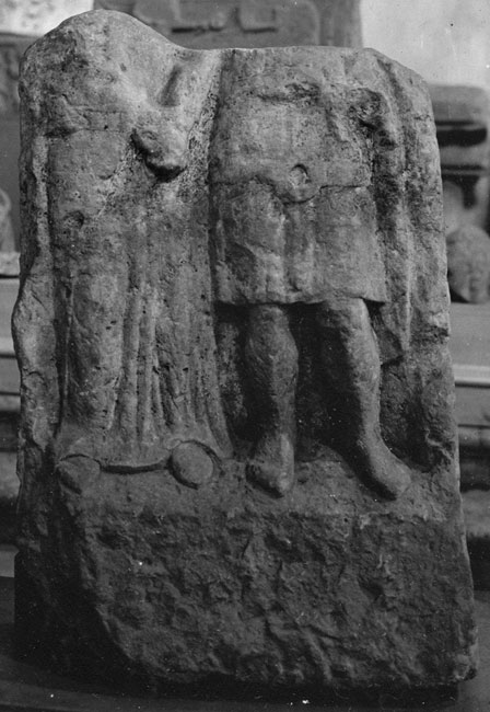 Auf der Rückseite (?) auf vorspringender Sockelleiste zwei stehende Ganzfiguren (Männer), die sich die Hände reichen. Beide in Sagum, kurzer Tunica, Gürtel mit Ringschnalle. Die rechte Figur wird von der Blockkante durchschnitten.