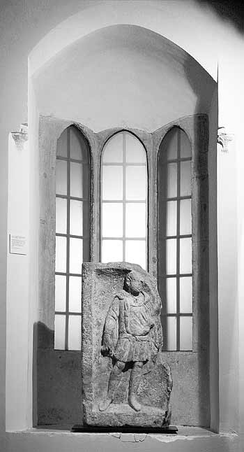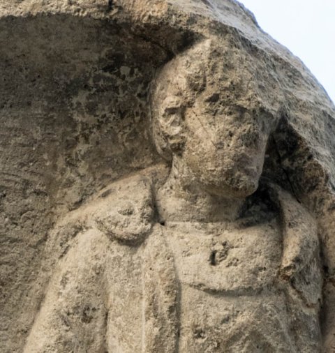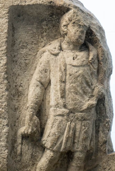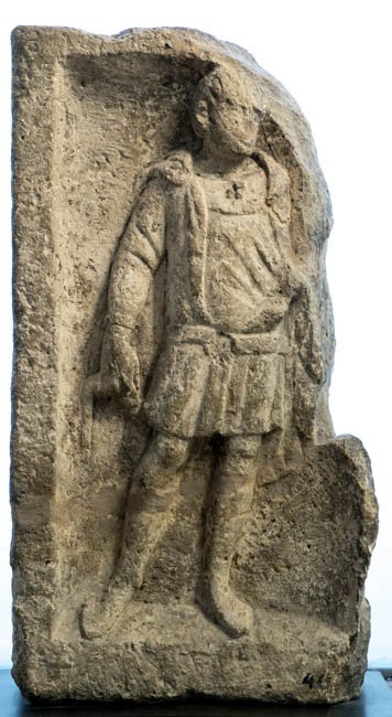 - In Rechtecknische stehende Ganzfigur eines Mannes (Soldat). Bärtig, Locken, Sagum mit großer Rosettenfibel, kurze Ärmeltunica, Gürtel mit Ringschnalle, am rechten Arm Armband (armilla).