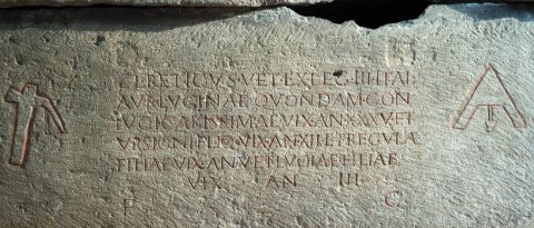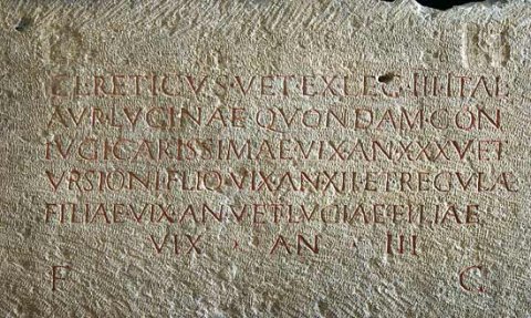 - D(is) M(anibus) / Cl(audius) Reticus vet(eranus) ex leg(ione) III Ital(ica) / Aur(eliae) Lucinae quondam con/iugi carissimae vix(it) an(nos) XXXV et / Vrisoni f(i)lio vix(it) an(nos) XII et Regulae / filiae vix(it) an(nos) V et Luciae filiae / vix(it) an(nos III / f(aciendum) c(uravit)