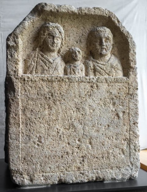 - Familie : in trapezförmigem Bildfeld Büsten eines Ehepaares mit Kind. Links Frau (Mittelscheitel, gewelltes Haar), rechts bärtiger Mann im Sagum, in der Mitte Kind.