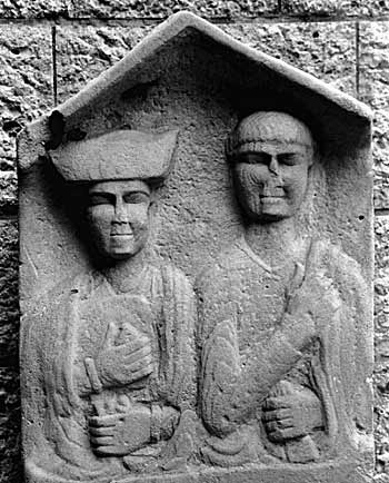 - Unter offenem Giebel zwei Halbfiguren (Ehepaar). Links einheimische Frau: Pelzhut, Umhang, Fibeln, in den Händen Spindel. Rechts Mann: bartlos, Ärmeltunica, Mantel, in der Linken Rolle (volumen) ?