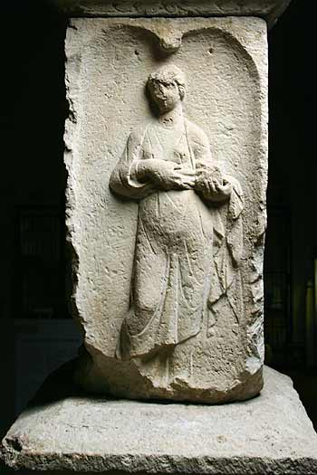 Auf der rechten Nebenseite Frau (Dienerin ?): in oben muschelförmiger Nische stehende Frau in langem Gewand und Mantel, in der Linken Kästchen. - Inschrift