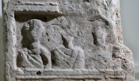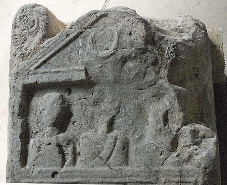 - Auf der erhaltenen Giebelecke liegender Löwe, im Giebelfeld Mondsichel, darüber Stern. Im Hauptbild Familie : Reste von drei bekleideten Büsten.