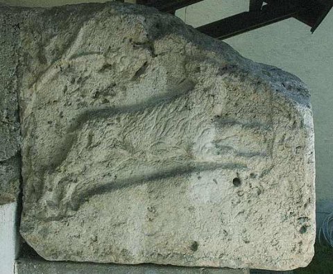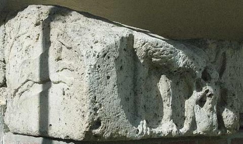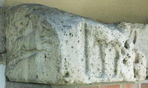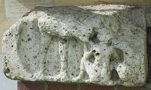 Eckblock: auf der Vorderseite Mythos: Lupa Capitolina in abgerundeter Nische.