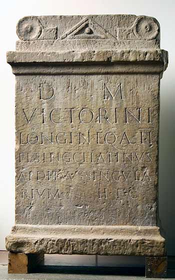 - D(is) M(anibus) / Victorini / Longini eq(uitis) a(lae) II / Fl(aviae) sing(ularium) Cl(audius) Latinus / Aedituus singula/rium h(eres) f(aciendum) c(uravit)
