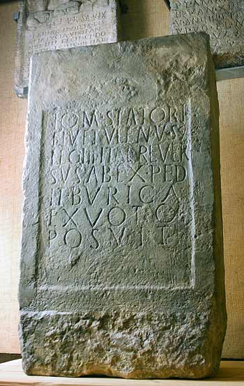 - I(ovi) o(ptimo) m(aximo) Statori / Fl(avius) Vetulenus / (centurio) / leg(ionis) III Ital(icae) rever/sus ab exped/it(ione) Burica / ex voto / posuit