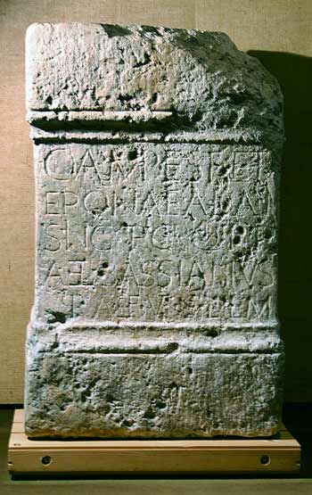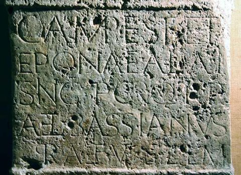- Campest(ribus) et / Eponae ala I / sing(ularium) p(ia) f(idelis) c(ivium) R(omanorum) qui prae(est) / Ael(ius) Bassianus / praef(ectus) v(otum) s(olvit) l(ibens) l(aetus) m(erito)