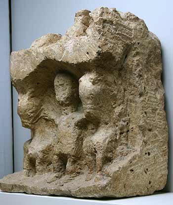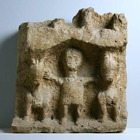 Im Sockelbild Calo : in Giebelnische stehende Figur in kurzem Gewand, hält mit ausgestreckten Armen die Zügel von zwei frontal dargestellten Pferden. Grabrelief.