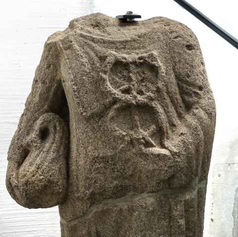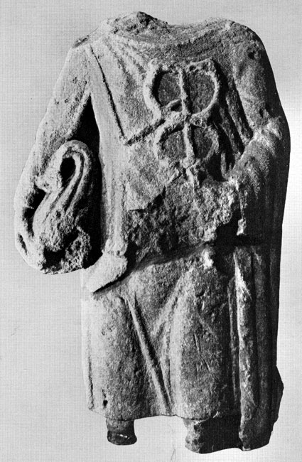 - Mythische Figur : stehender Mercur in kurzer Ärmeltunica und auf der rechten Schulter zusammengehaltenem Mantel, in der Linken Heroldsstab (caduceus), in der Rechten Geldbeutel.