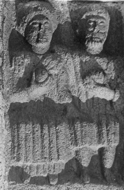 - In Rechtecknische zwei sitzende Ganzfiguren (Ehepaar). Links einheimische Frau mit Haube, Unter- und Obergewand, in der Rechten Frucht. Rechts bärtiger Mann mit in die Stirn gekämmtem Haar, halblanges Ärmelgewand, in der Linken Attribut.