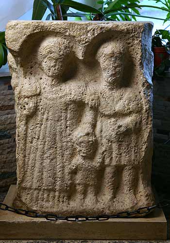 Auf der Vorderseite Familie : unter zwei Bogennischen Ganzfiguren eines Ehepaares mit Kind. Links einheimische Frau mit Ober- und Untergewand, Haube (?). Rechts Mann in kurzer Tunica und Sagum (?), in der Linken Gefäß oder Rolle (volumen) (?). Zwischen den Eltern Kleinkind in kurzem Gewand.