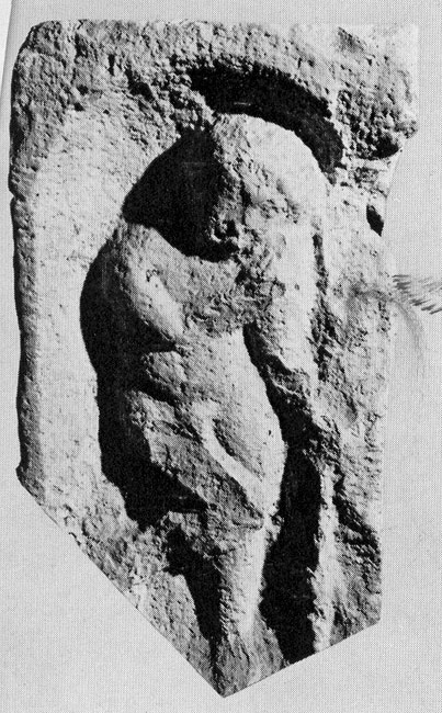 Auf der Rückseite in Bogennische frontal stehende weibliche Figur mit offenem Haar, Arme vor den Leib gelegt.
