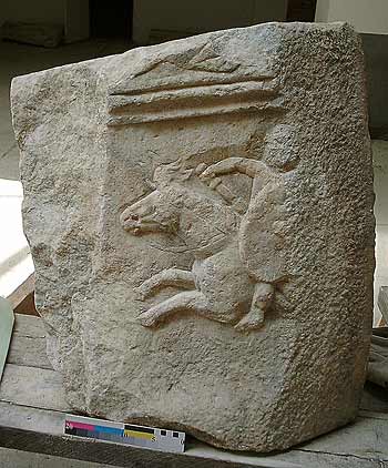 - Nach links galoppierender Reiter (Soldat). Waffen: ovaler Schild, in der Rechten Schwert. Oben profilierter Rahmen und Blatt einer Ranke.