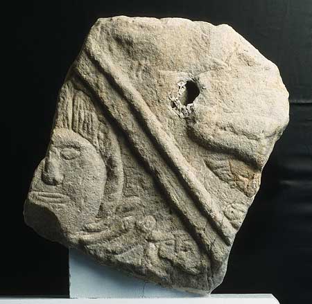 - Eingeschriebener Giebel mit Gorgoneion, auf den Schrägen Delphin.