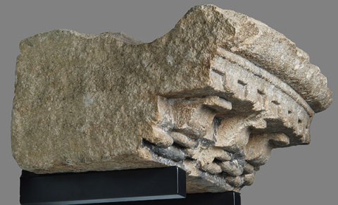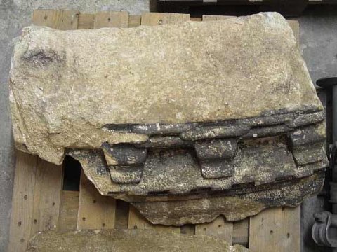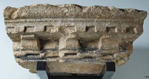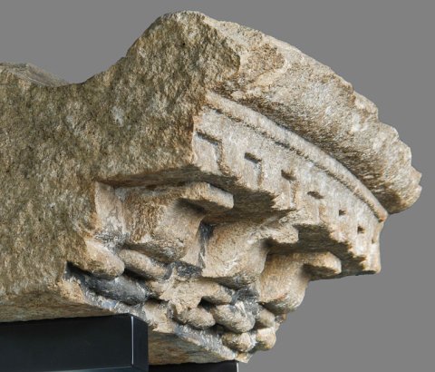 - Traufgesims eines Kegeldaches : Unter der S-förmig geschwungenen Sima Zahnschnitt, Konsolfries und umlaufende Kette.