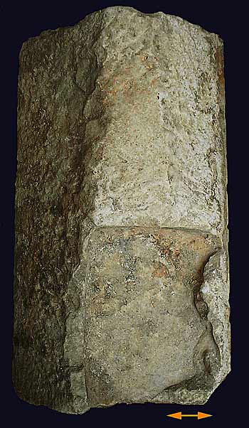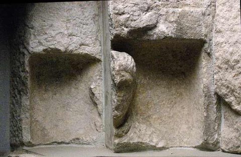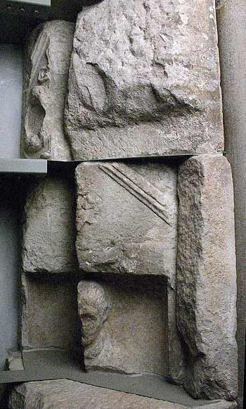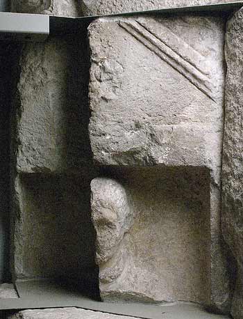 - Rest eines eingeschriebenen Giebels mit profiliertem Rahmen. Unkenntlicher Reliefrest. Im Hauptbild Porträt (Brustbild ?) eines Mannes (Soldat, bartlos, gesträhntes Haar, Halstuch).
