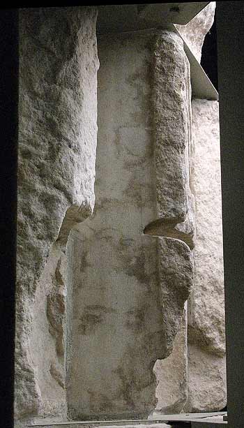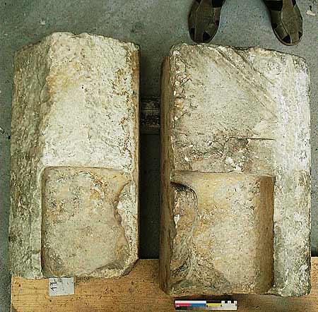 - 2 Fragmente einer vertikal durchschnittenen Stele, rundum beschnitten, Relief tlw. völlig abgeschlagen