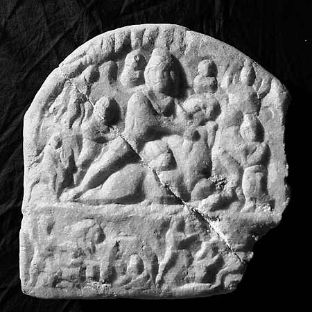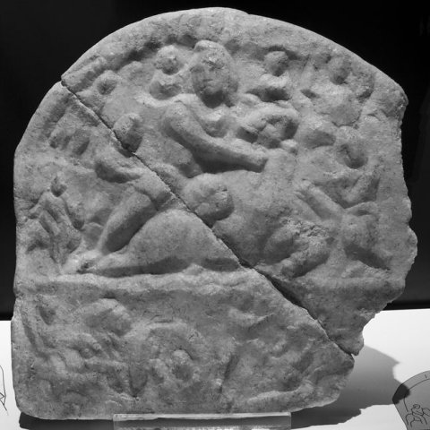 - Mythos (Mithras): in halbrund abgeschlossenem Bildfeld Stiertötung (Tauroktonie) mit Cautes und Cautopates, Büsten von Sol und Luna, links Mithras auf dem Stier reitend und den Stier auf dem Rücken schleppend. Rechts oben Felsgeburt. Weitere Szenen auf dem unteren Bildstreifen.