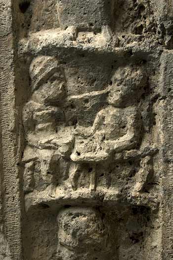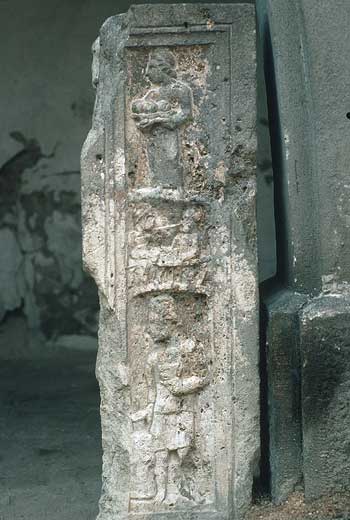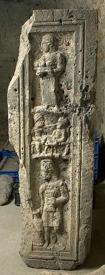 - Pfeilerförmiger Block. Auf der Vorderseite gerahmtes hochrechteckiges Feld, durch horizontale Stege in drei Teile gegliedert. Oben Dienerin mit Fruchtschale in den Händen. In der Mitte Totenmahl mit gelagertem Mann und links sitzender Frau. Unten Diener in kurzer Ärmeltunica, in der Linken Becher, neben dem rechten Bein großer Krug.