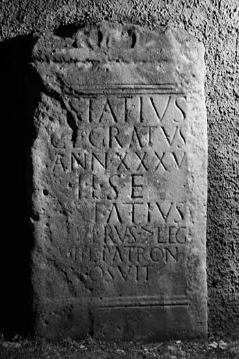 - [C(aius)] Statius / C(ai) l(ibertus) Gratus / ann(orum) XXXV / h(ic) s(itus) e(st) / C(aius) Statius / Severus (centurio) leg(ionis) / XIII patron(us) / posuit