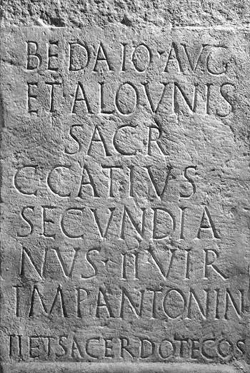 - Bedaio Aug(usto) / et Alounis / sac(rum) / C(aius) Catius / Secundia/nus II vir / Imp(eratore) Antonin(o) / II et Sacerdote co(n)s(ulibus)