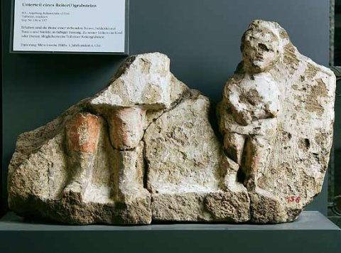 - Frontal stehender Mann in knielanger Tunica und Stiefeln. Neben dem linken Bein stehendes Kind (Knabe, Diener ?) in kurzem Gewand.