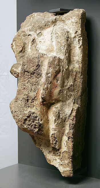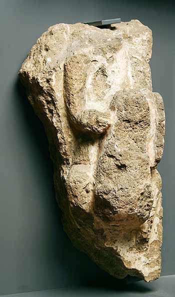 - Rest eines frontal dargestellten Reiters mit Schild. Grabrelief.