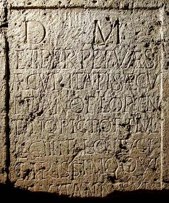 - D(is) M(anibus) / et perpetuae s/aecuri/tati(!) Saecu/ndano(!) Floren/tino Pictori mil(iti) / leg(ionis) III Ital(icae) coniugi / carissimo qui / vixit annis XLV / [---