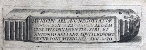 - Municipi Ael(i) Aug(usti) negotiator(es) / vestiariae et lintiariae aedem / cum suis ornamentis sibi et P(ublio) pat(ri) / C(aio) Antonio Aeliano equiti Romano / decurioni municipi(i) Ael(iae) Aug(ustae) filio