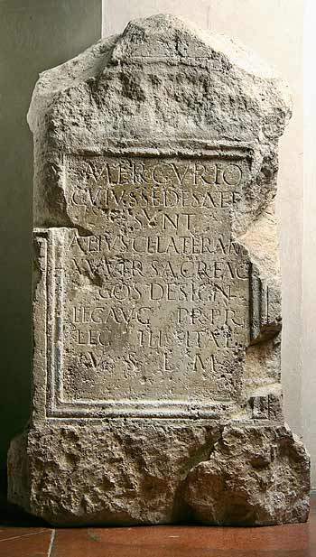 - Mercurio / cuius sedes a tergo / sunt / Appius Cl(audius) Lateranus / XVvir sacr(is) fac(iundis) / co(n)s(ul) design(atus) / leg(atus) Aug(usti) pr(o) pr(aetore) / leg(ionis) III Ital(icae) / v(otum) s(olvit) l(ibens) m(erito