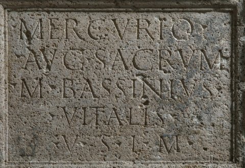 - Mercurio / Aug(usto) sacrum / M(arcus) Bassinius / Vitalis v(otum) s(olvit) l(ibens) m(erito)