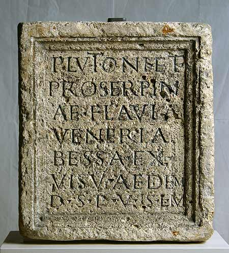 - Plutoni et / Proserpin/ae Flavia / Veneria / Bessa ex / visu aedem / d(e) s(uo) p(osuit) v(otum) s(olvit) l(ibens) m(erito)