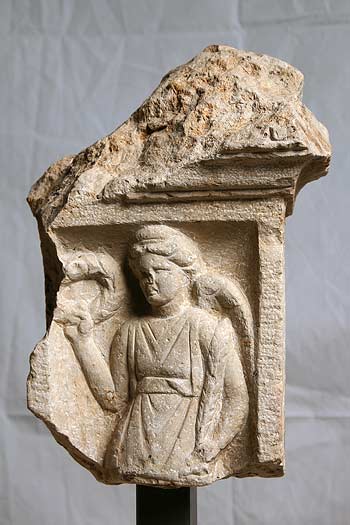 - Mythische Figur : in Rechtecknische stehende Victoria mit Diadem, Chiton mit Gürtel, in der erhobenen Rechten Kranz, im linken Arm Palmzweig. Oben Ansatz eines Giebels mit profiliertem Rahmen.