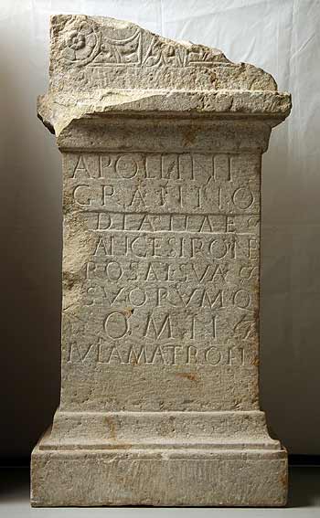 - Apollini / Granno / Dianae / [s]anct(a)e Siron(a)e / [p]ro sal(ute) sua / suorumq(ue) / omn(ium) / Iulia Matrona