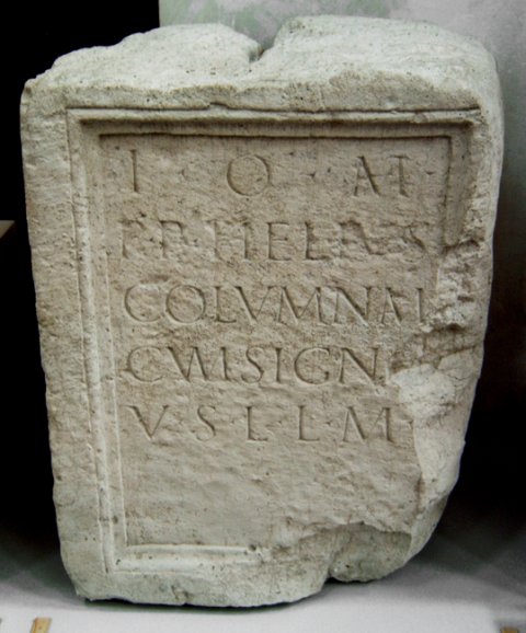 - I(ovi) O(ptimo) M(aximo) / P(ublius) P() Helius / columnam / cum signo / v(otum) s(olvit) l(ibens) l(aetus) m(erito)