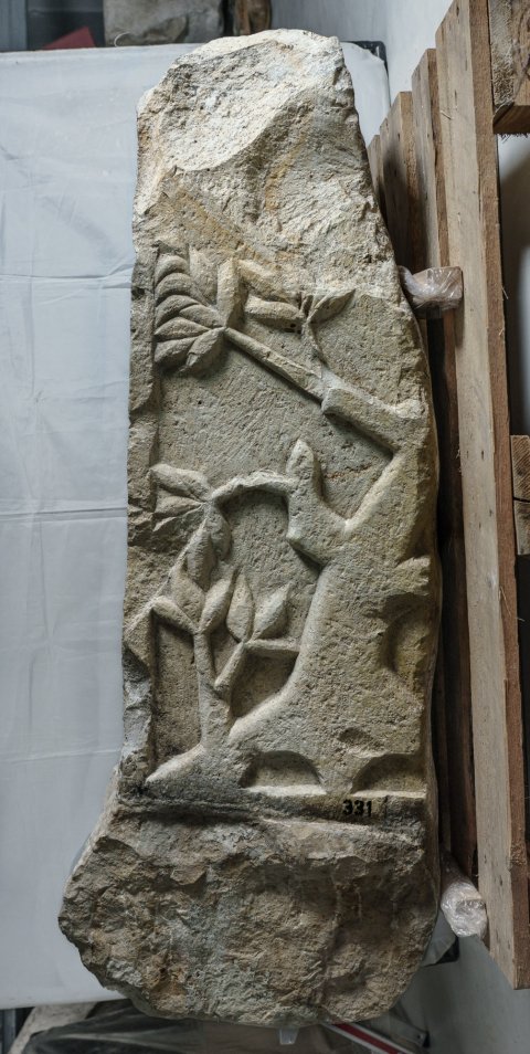 - 3 Fragmente (rechter Pulvinus, hinten abgebr.; Rückseite mit Teil der linken Nebenseite; linker Teil der Inschrift mit Teil der linken Nebenseite); rechte Altarhälfte ergänzt