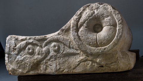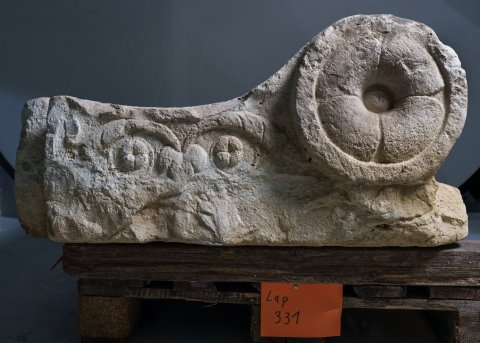 Volutenpolster (pulvini), Seiten geschuppt, in der Mitte Band, in den Voluten Rosetten, dazwischen Ranken.