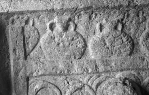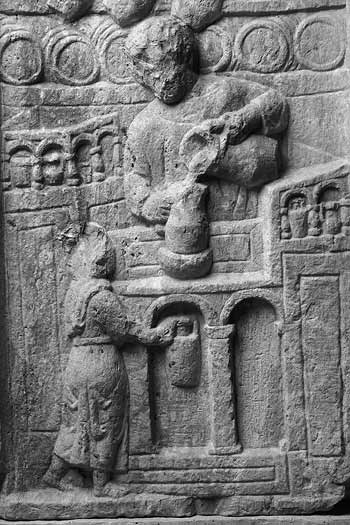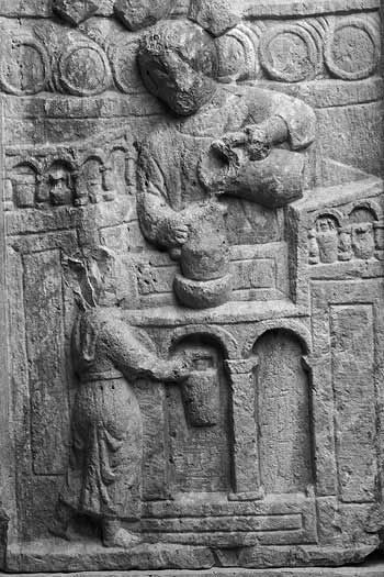Auf den Nebenseiten Szenen beim Weinhändler. Links Weinverkauf : hinter einem durch Arkadennischen gegliederten Verkaufspult steht der Verkäufer in Ärmeltunica und gießt Wein in einen Krug, der in der Schale eines Trichters steht, dessen Rohr durch die Tischfläche führt. Der von links herantretende Kunde (Kundin ?) in langem gegürteten Ärmelgewand hält seinen Krug unter den Trichter. Die Brüstung des Verkaufspultes hat kleine Arkadennischen, in denen Gefäße stehen. An der Wand im Hintergrund ein Regal mit Fässern und bauchigen Korbflaschen, davor hängen drei Krüge.
