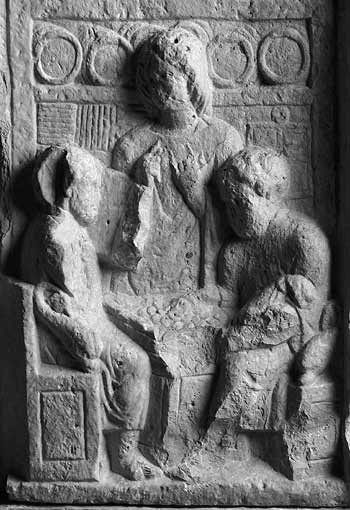 Rechts Abrechnung : zwei auf Lehnstühlen mit Armlehnen in Delphinform sitzende Männer zählen Münzen, die den truhenförmigen Tisch zwischen ihnen bedecken. Hinter dem Tisch stehende Frau, die mit Hilfe ihrer Finger rechnet. An der Wand im Hintergrund Regal mit Schreibtafeln, darüber Fässer und Korbflaschen. - Inschrift