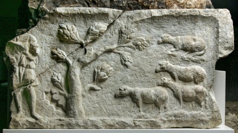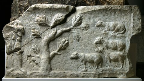 - Tiere : einfach gerahmtes Rechteckfeld, in der Mitte Baum, links am Rand Mann (Hirte) in kurzer gegürteter Tunica, der ein Schaf in den Armen hält. Links vom Baumstamm angedeuteter Felsspalt (?). Rechts des Baumes Schafe (drei stehende, ein liegendes).