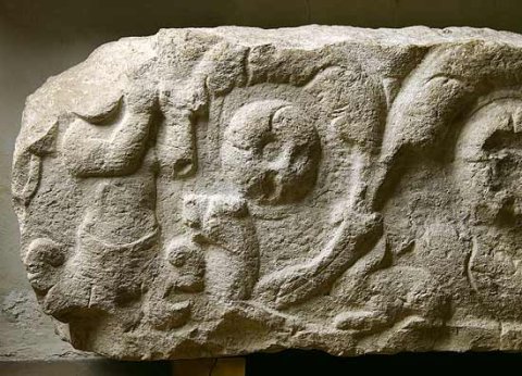 - Zu drei Voluten gerollte Akanthusranke mit Blütenfüllung, links nackter Jüngling, dessen Hüften in Blätter übergehen, mit zum Kopf erhobenen Händen, Stab (?) in der Linken. Anschließend Vorderteil eines nach rechts hin liegenden Panthers mit zurückgedrehtem Kopf und nach links hin kauernder Hase. Auf der rechten Nebenseite Reliefreste.
