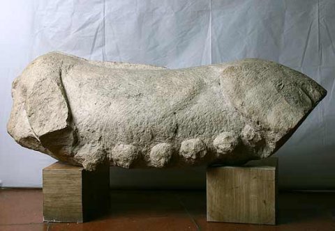 - Mythische Figur (Sphinx) : Löwenrumpf mit Zitzen, auf dem Rücken Ansatz von Flügeln, auf der Brust Rest von Locken und Ansatz menschlicher Arme (?).