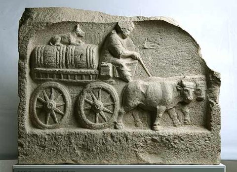 - Eckblock: auf der Vorderseite Unterteil einer in einem Sessel aus Flechtwerk sitzenden Frau mit stehender Dienerin. Auf der linken Nebenseite Wagenszene: nach rechts fahrender Leiterwagen mit zwei Fässern, auf denen ein hechelnder Hund liegt. Kutscher im Kapuzenmantel treibt das Ochsengespann mit dem Stock an.