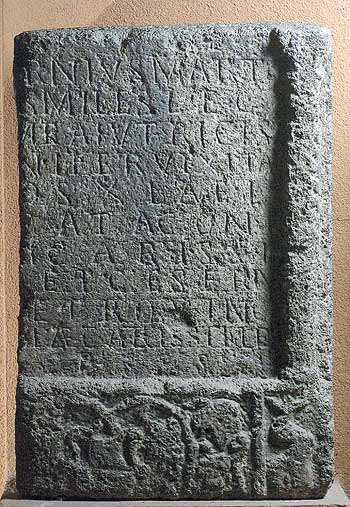 - [D(is)] M(anibus) / [C(a)ese]rnius Marti/[ali]s miles leg(ionis) [pri]m(a)e a(d)iutricis / [sig]nifer vixit a/[nn]os XL Ael(ia) / [---]ata coni/[ug]i carissi/[mo] et C(a)esern/[ia]e Provinci/[ae fil]iae carissim(a)e / [p]os(uit)