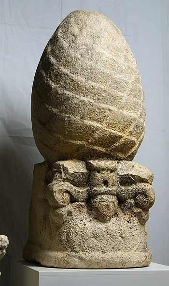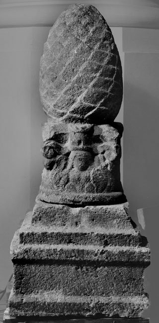 - Geschuppter Pinienzapfen auf einem Kapitell, zwischen dessen Voluten weibliche Büste erkennbar ist. Vierseitiger Sockel.