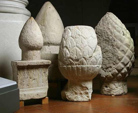 - Pinienzapfen mit rhombischen Schuppen, auf dem Hals Blattdekor