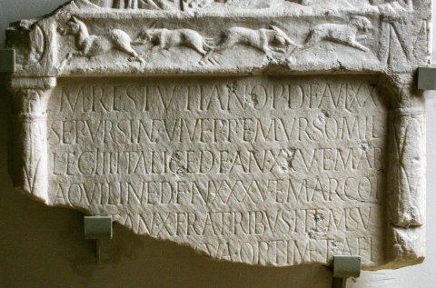 - D(is) M(anibus) // M(arcio) Restutiano p(atri) d(e)f(uncto) an(norum) LXXV / Sep(timiae) Ursin(a)e viv(a)e p(arentibus) p(ientissimis) et M(arcio) Urso mil(iti) / leg(ionis) III Italic(a)e d(e)f(uncto) an(norum) XXXV et Mar(cio) Coto / [--] d(e)f(uncto) an(norum) X fratribus item Su/[--- coniu]g(i) sua(e) optim(a)e et Ael(i-) / [---
